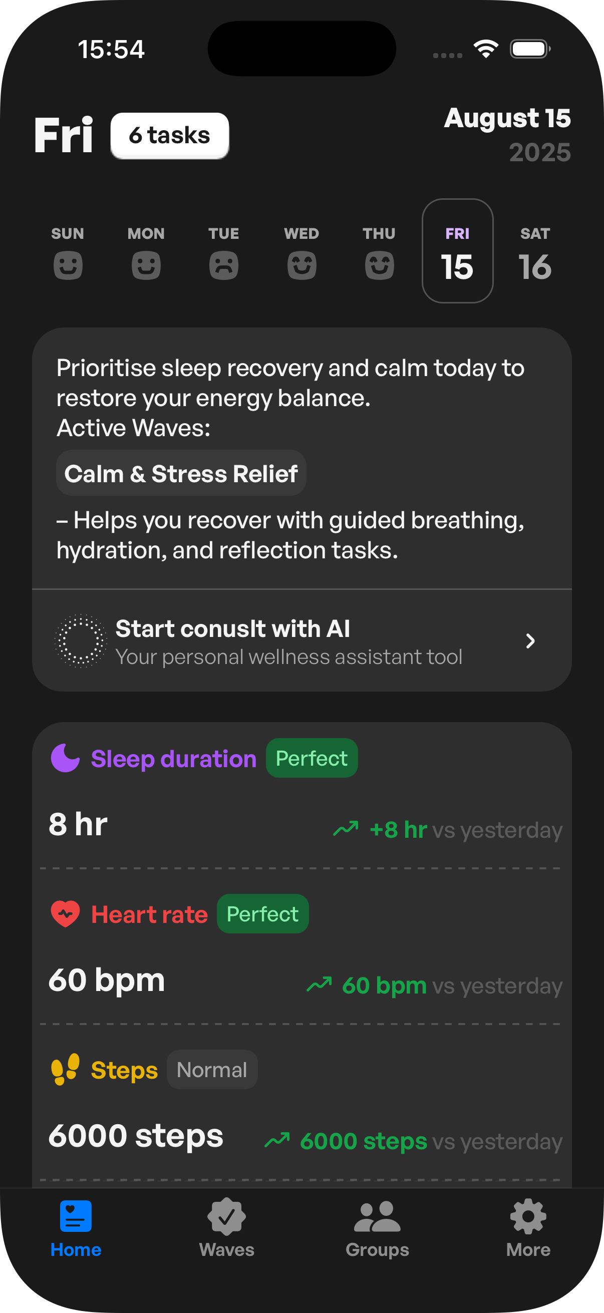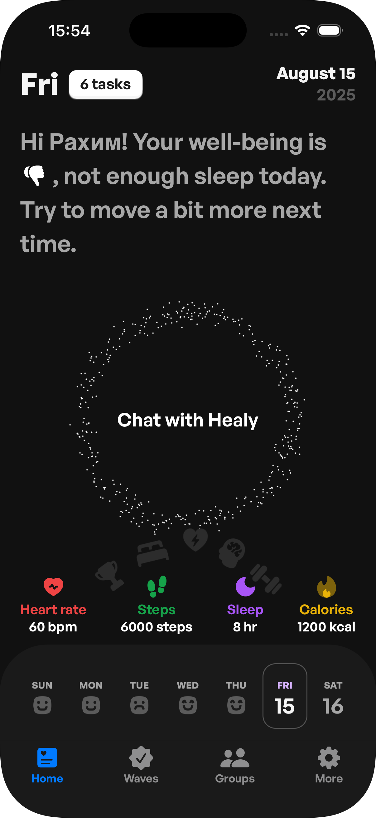 Healy analyzes your health data, lifestyle habits, and daily routine, then recommends short activities called Waves — like Sleep, Energy, Focus, Calm, and Family — to guide you at the right time.